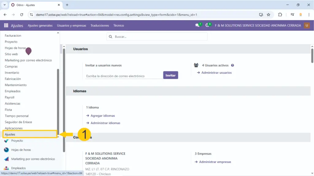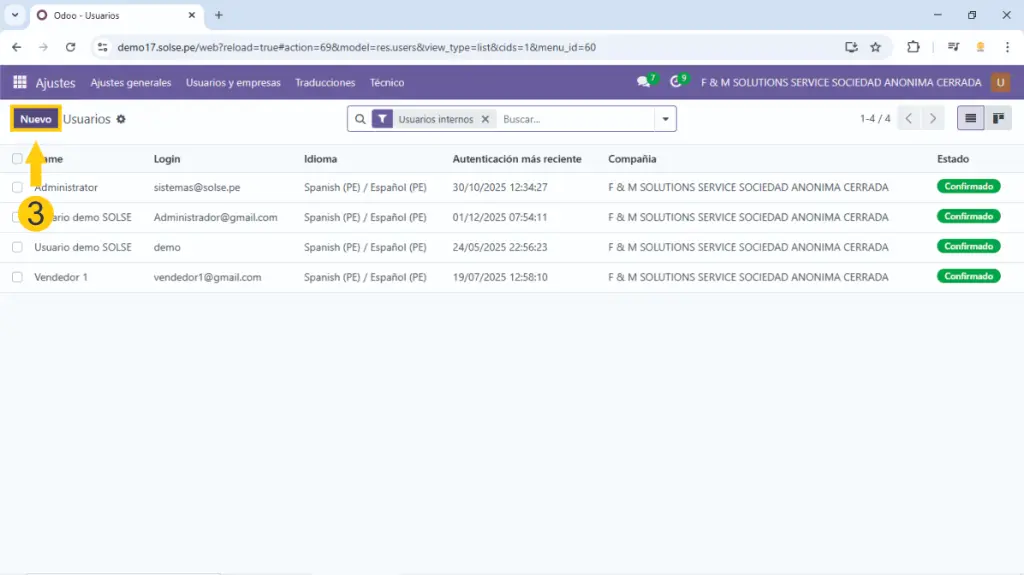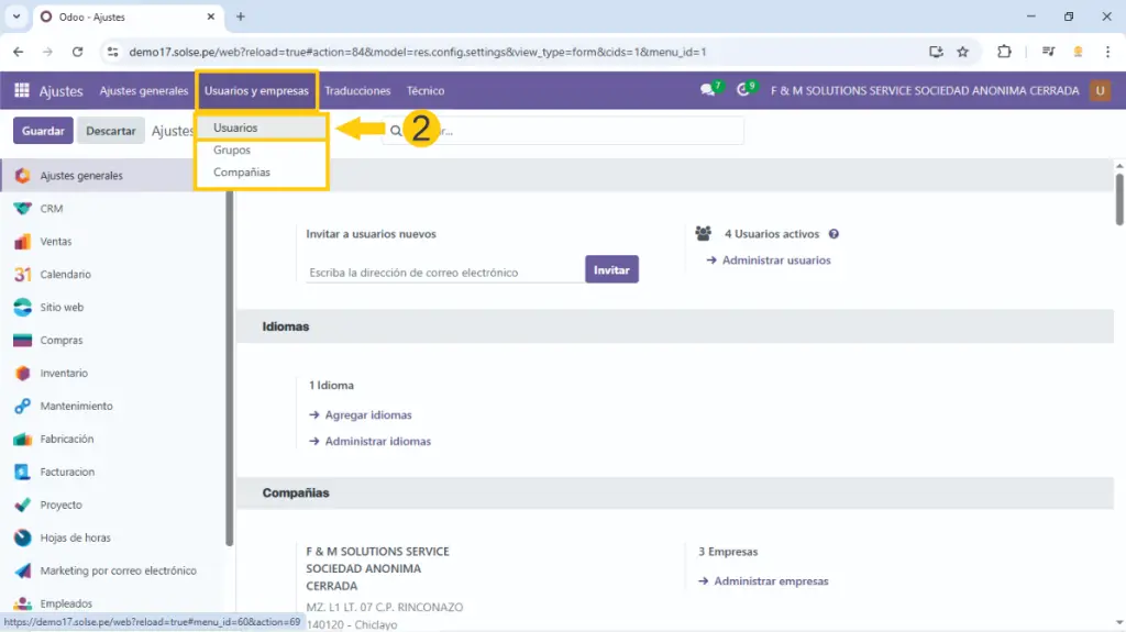 2) Hacemos clic en "Usuarios y compañías" luego clic en "Usuarios"
