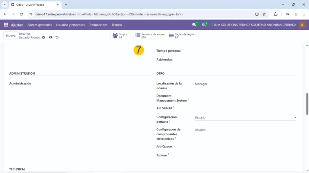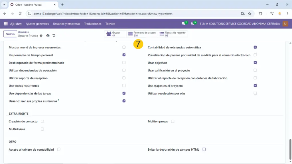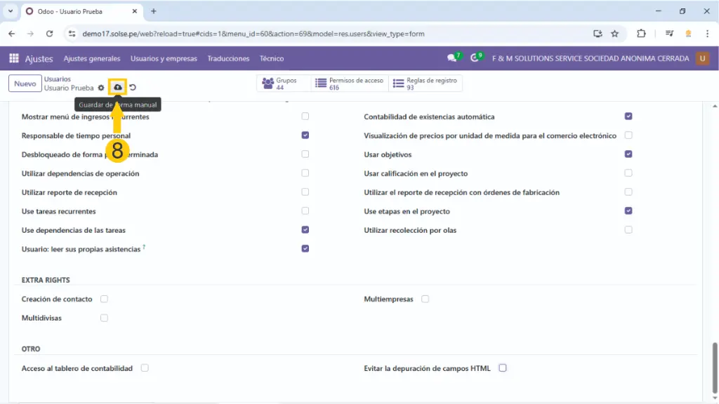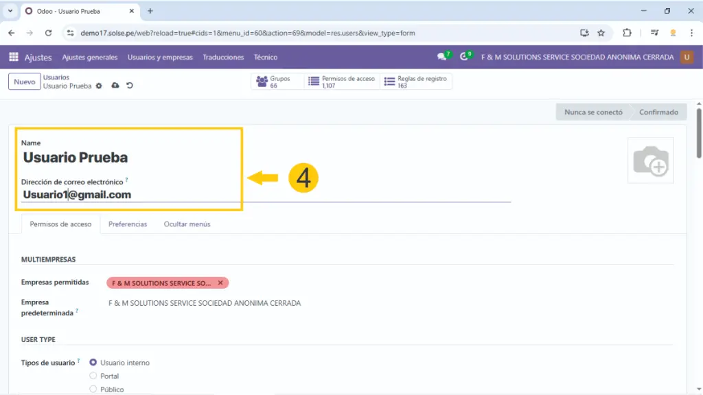 5) Si se trabaja con multiempresa colocamos a que empresas va a tener acceso ese usuario así como cual es la empresa principal, también dejamos marcado en usuario interno.