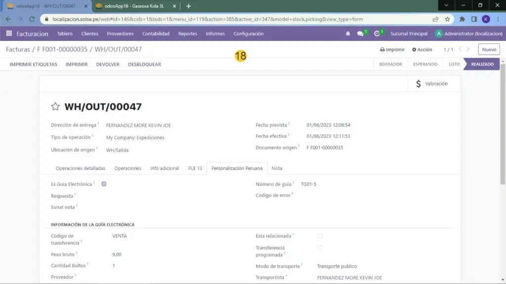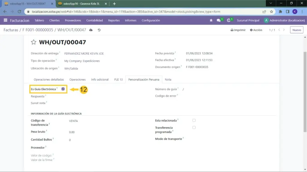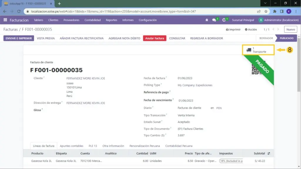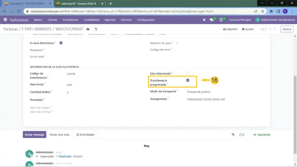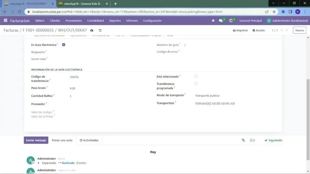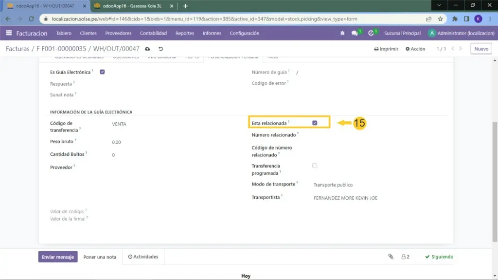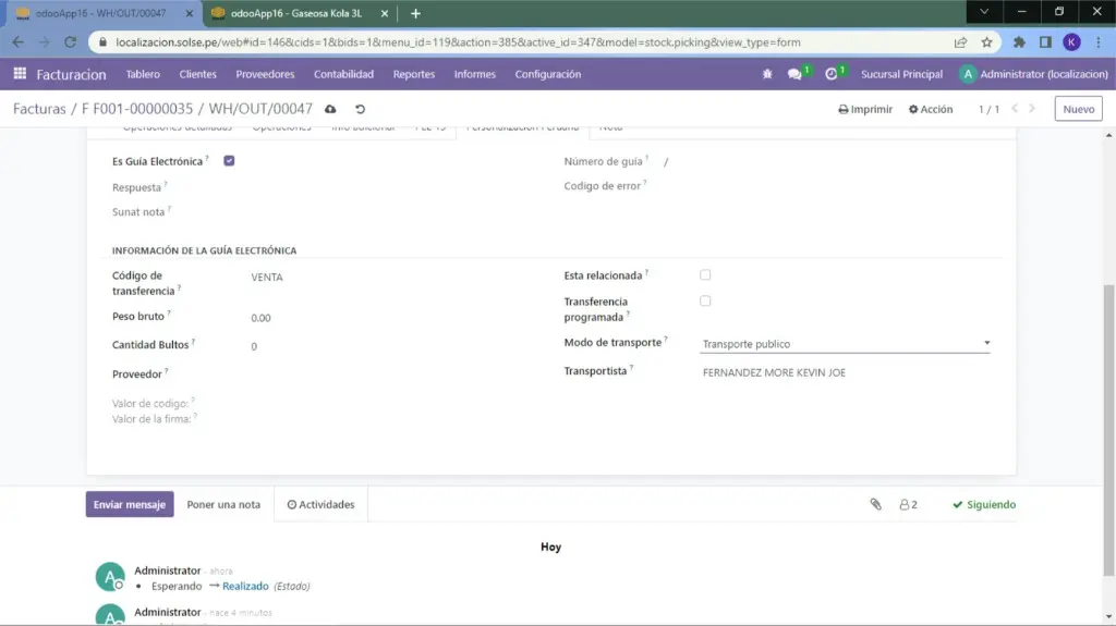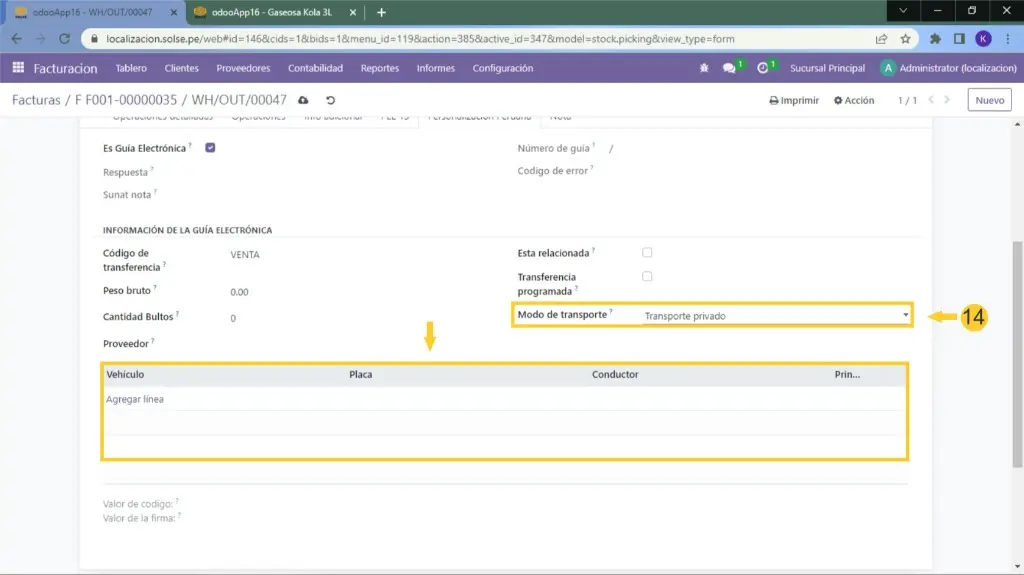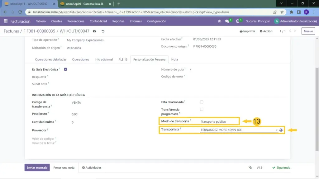 13) En modo de transporte podemos colocar "Transporte público" y agregar "Transportista" (El transportista debe tener dirección).