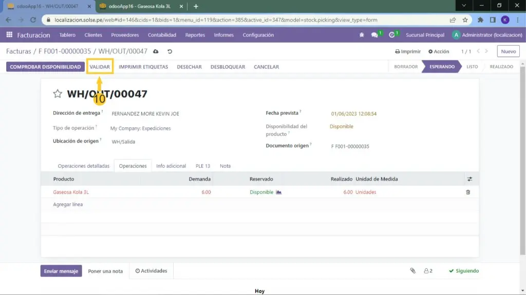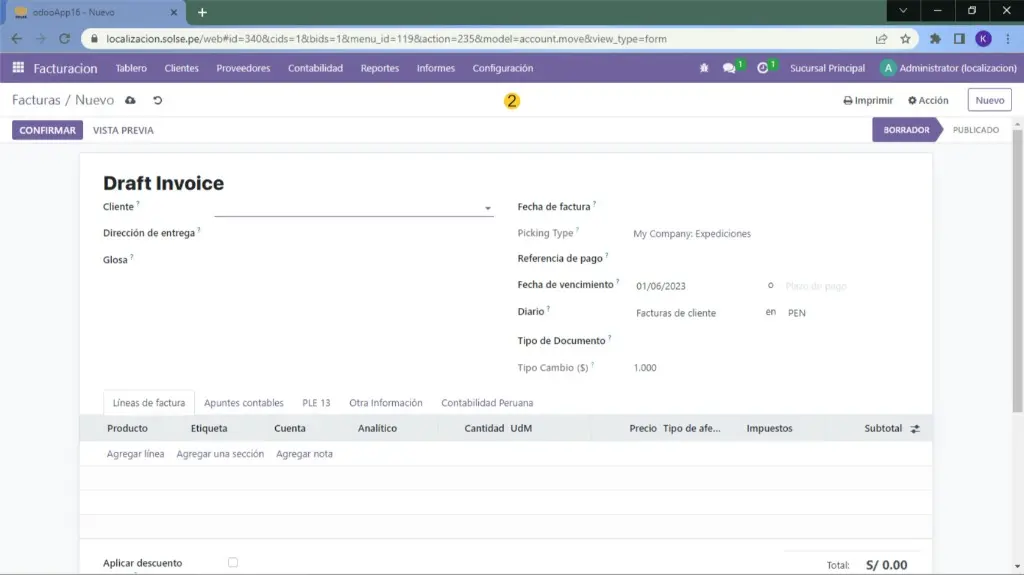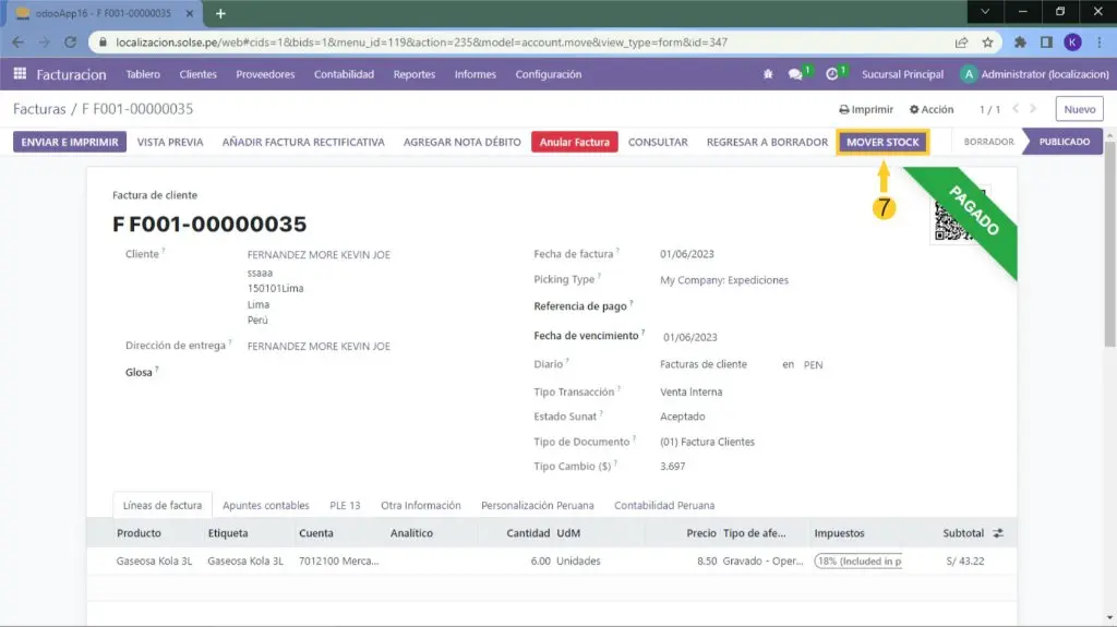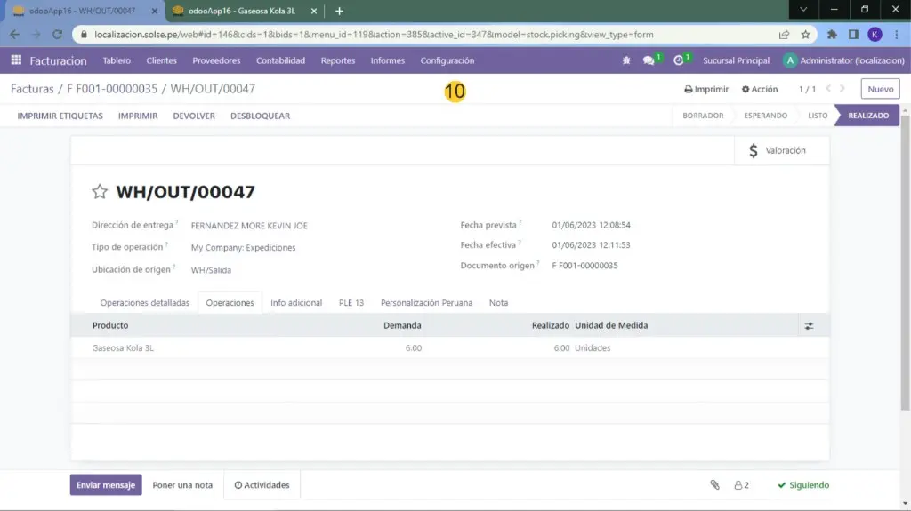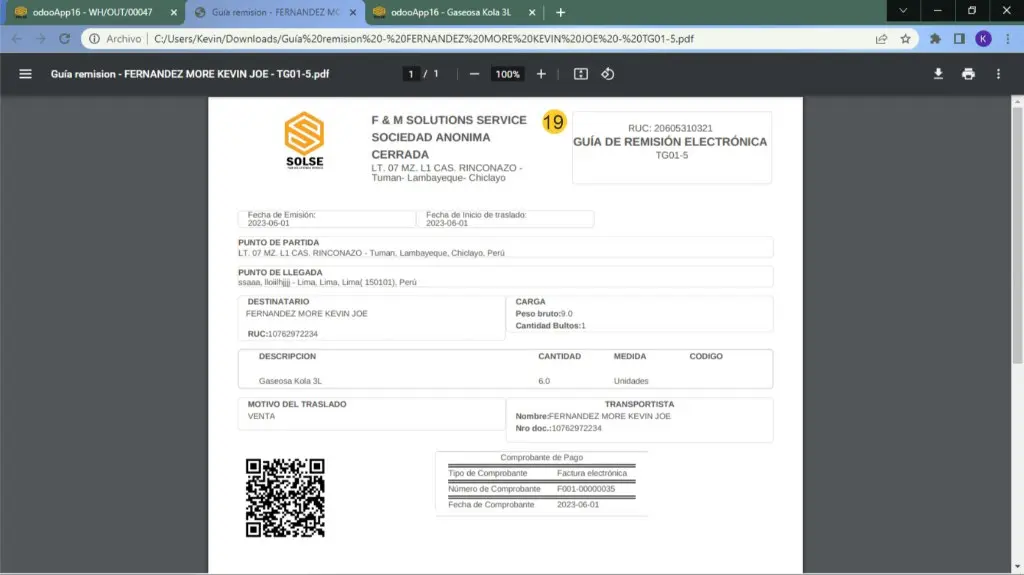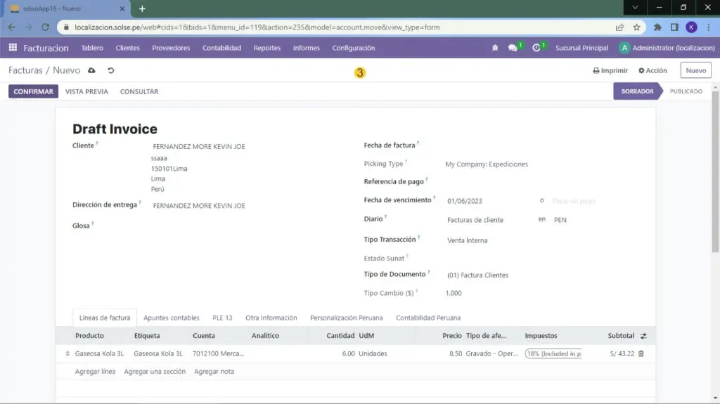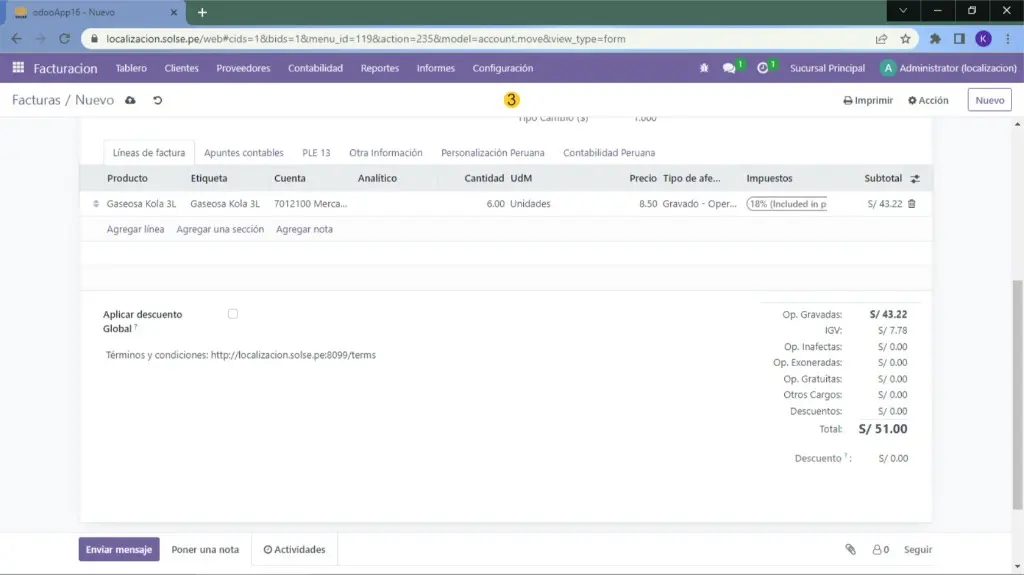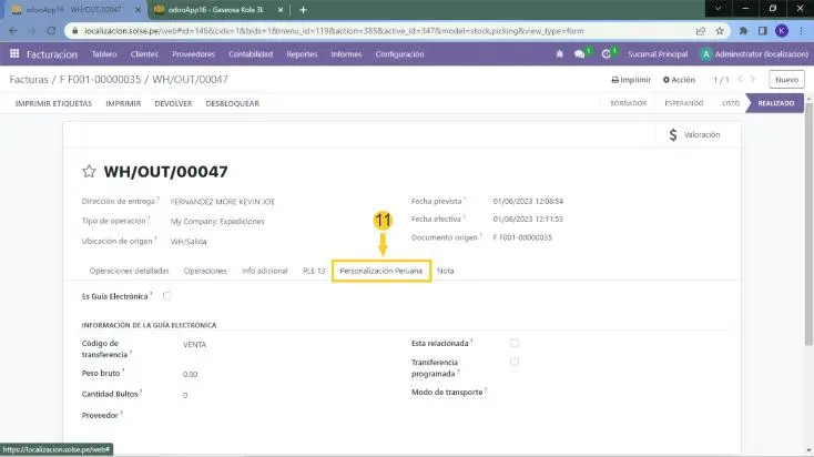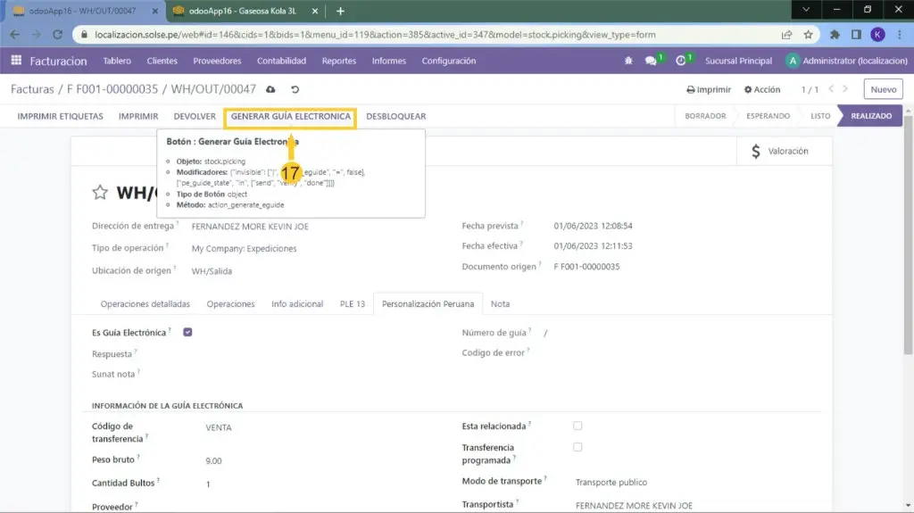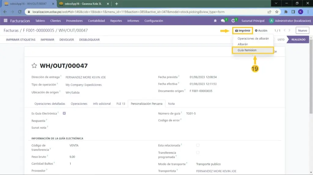 13) En modo de transporte podemos colocar "Transporte público" y agregar "Transportista" (El transportista debe tener dirección).