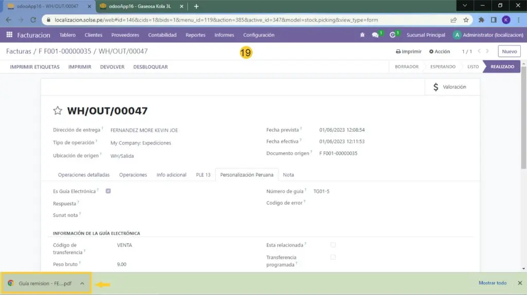 18) La guía estará realizada (Como es una guía de prueba no aparecerá los datos de respuesta, eso aparece cuando se está en producción).
