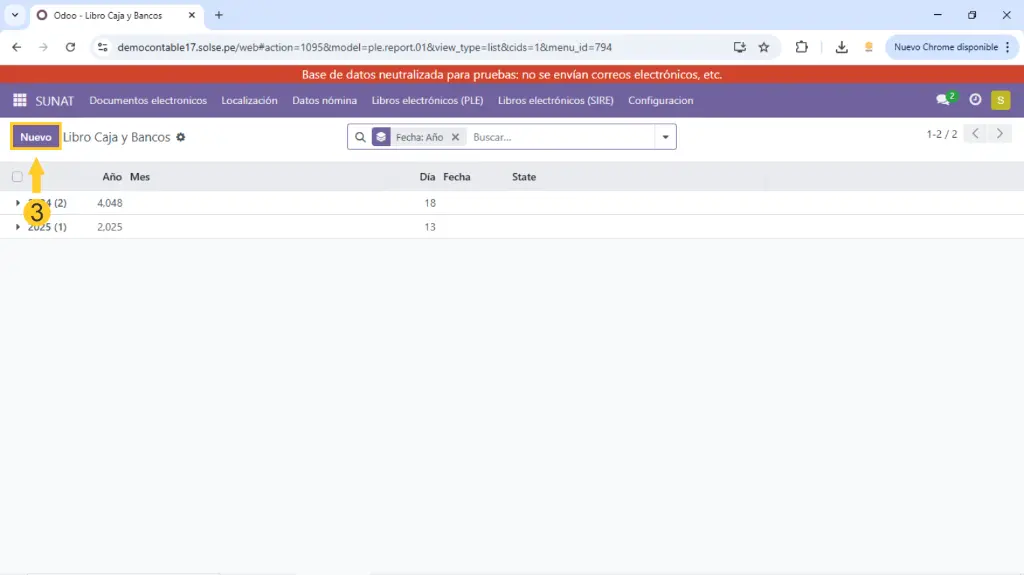 3) Podemos realizar una nueva declaración de libro diario caja y banco, damos clic en "Nuevo".