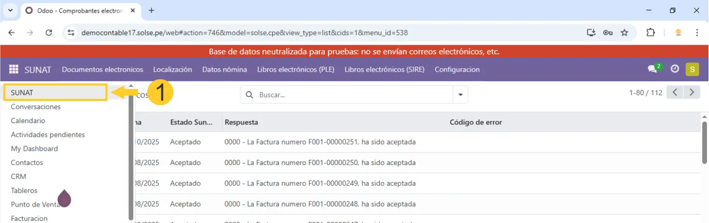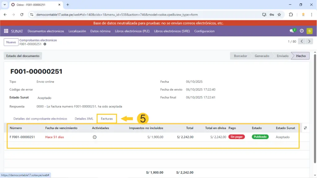 5) Si nos dirigimos a "Facturas" podemos observar la factura que se ha enviado a SUNAT.