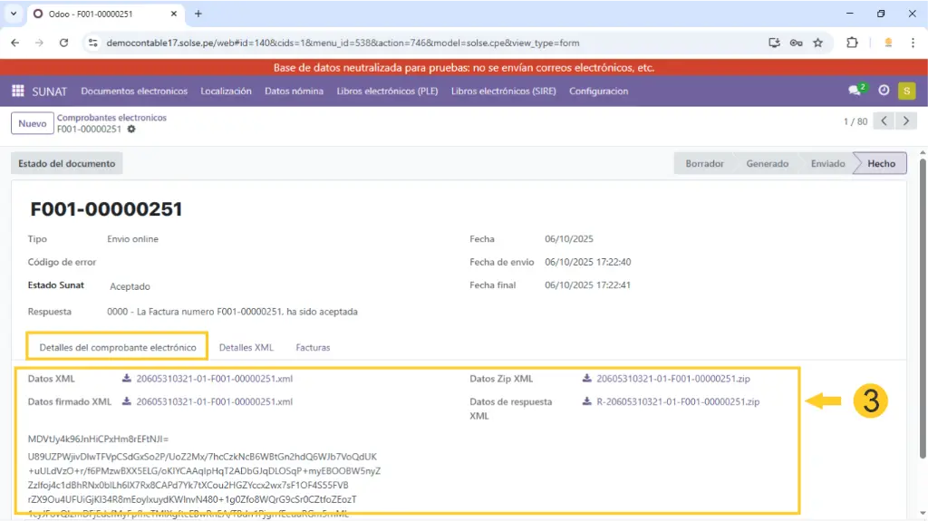 3) Luego observamos nos dirigimos a "Detalles del comprobante electrónico", Podemos observar los datos XML, así como los datos firmado XML, Datos Zip XML, Datos de respuesta XML.