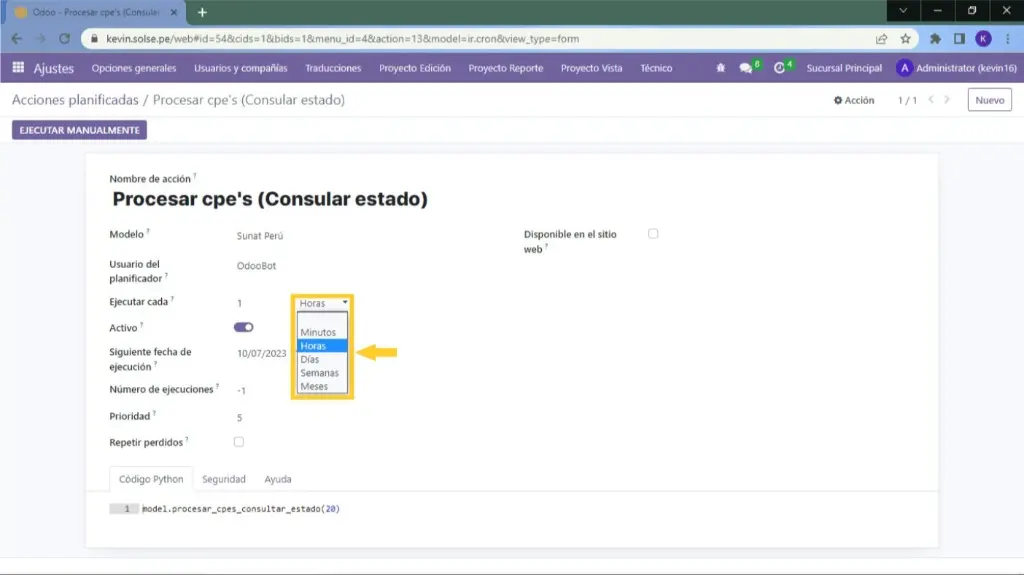 10) En el campo "Ejecutar cada" podemos elegir el tiempo en que deseamos que se ejecute ya sean minutos, horas, días, semanas o meses.