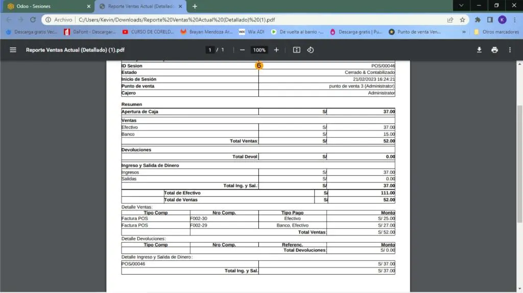 5) Se nos descargará un PDF donde estará el reporte de venta de POS.