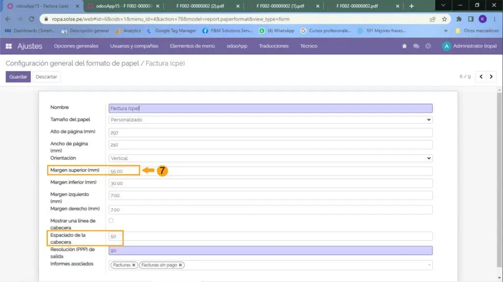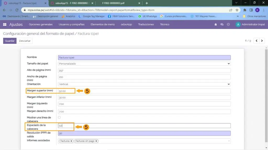 5) Vamos a colocar en "Margen superior (mm) 50 y en "Espaciado de la cabeza" 50. (para el ejemplo).
