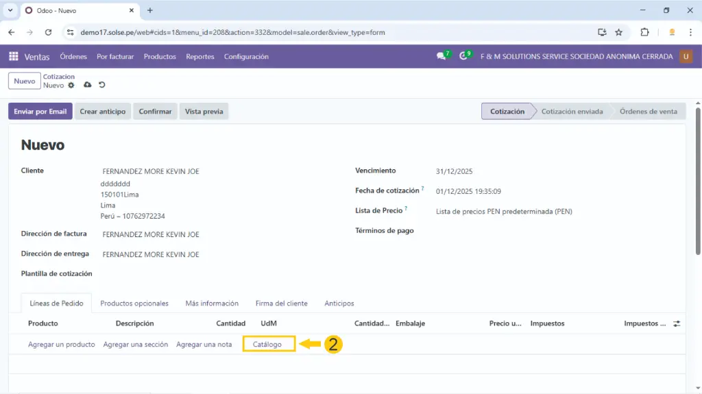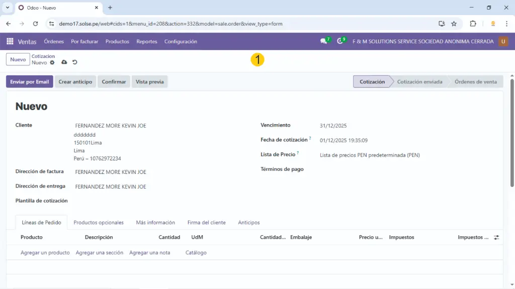 1). Nos dirigimos al módulo de venta y creamos una cotización.