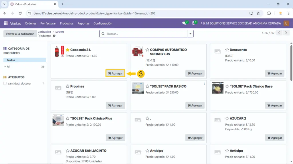 3). En la parte inferior derecha damos clic en "Agregar" para poder agregar el producto en la cotización, podemos colocar la cantidad del producto deseado así continuamos con los otros productos que se desea agregar.